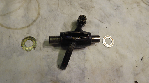 Das Spiel muss nicht vollständig ausgeglichen werden, etwas Spiel muss sein, so dass die Kipphebel frei laufen können, weil sonst die Scheiben im Kopf auf den Kipphebelböcke einlaufen würden. Es ist besser 2 dünne Scheiben, auf jeder Seite eine, als nur eine dicke Scheibe auf einer Seite einzubauen. Die Scheiben dienen auch als Anlaufscheiben im weichen Aluminium, sie sind nicht nur zur Distanzierung.