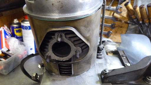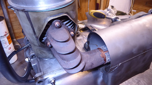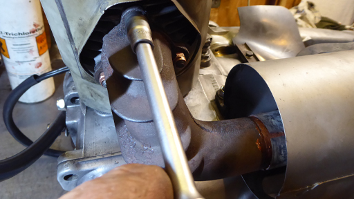- Man montiert dann der Krümmer an Zylinderkopf mit den 3 Kupfermuttern (Dichtung nicht vergessen) , aber man zieht den Krümmer nicht an, der Krümmer ist jetzt noch beweglich