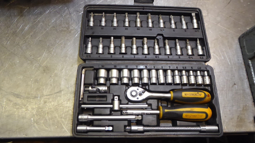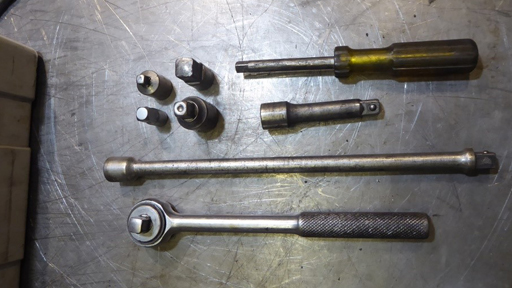 Ich (H) empfehle ¼ und 3/8-Zoll, das ist ausreichend für unterwegs und nicht so schwer wie ½-Zoll. Für die Schlüsselweite (SW) 22-Mutter der Hinterachse wird ½ Zoll benötigt; es wird mit 160 Nm angezogen, gell!!! Hierfür habe ich ein Adapterstück 3/8 auf ½ Zoll oder einen Knebel in 1/2 Zoll dabei.
